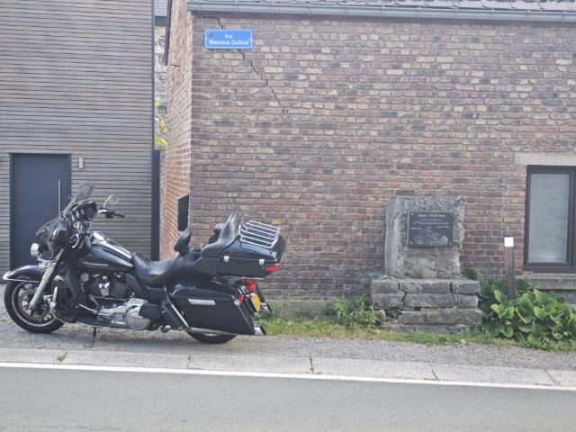 De navigatie gaat aan, de motor geeft een brul als deze tot leven komt en ik zwaai m'n been over het zadel. Klonk de versnelling gaat in z'n 1 en ik rol naar de uitgang. De route gaat nu de weg wijzen. Eerst de snelweg op naar Maastricht. Hierna voor Luik richting Namen. Iets verder heb ik een waypoint gezet bij het monument van Fergus Anderson bij het voormalige motor circuit de Floreffe. Een foto momentje dus. Anderson was een Schotse motorcoureur die op het circuit van Floreffe op zijn racemotor overleden is. Na zijn ongeluk is er nooit meer geraced op het stratencircuit