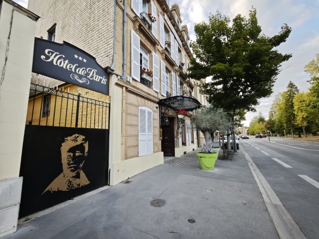 Onderweg nagenoeg geen spetters, en wat er spettert krijgt geen naam van mij. Bij Charleville-Mézières vind ik een slaapplaats in Hotel Paris. Een leuk Boutique hotelletje met een binnenplaats waar ik de motor kan plaatsen. Als eerste krijg ik een koud biertje in m'n handen geduwd van de man bij de receptie. Kijk dat is nou een warm, euh goed, welkom. Buiten zitten nog 2 Duitse motorrijders en nadat ik het papierwerk voor de kamer in orde heb gebracht ga ik buiten nog even kletsen met de mannen. Zij blijven enkele dagen in dit hotel en gaan de omgeving verkennen. Een van de mannen rijdt op een originele paarse BMW GS 100R Dakar uitvoeren, prachtig. Buiten het spuuglelijke kleurtje, tja over smaak valt te twisten he, een gave originele motor.
