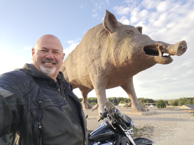 Ik stuur het stadje uit. Eerst een stuk binnendoor, kronkelend over de doorgaande wegen en dan toch naar de snelweg. Daar zie ik het gigantische wild zwijn, Woinic, opdoemen, dus even de afslag nemen naar de andere kant voor foto en film.