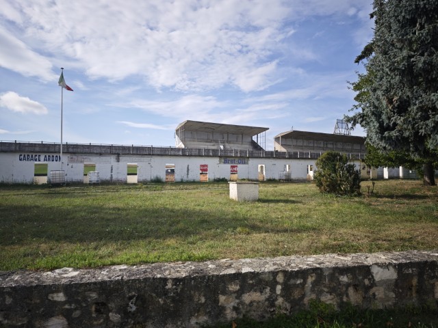 Hierna weer de snelweg op. Het verkeer gaat lekker en om half 9 rij ik over het nog overgebleven startstuk van het oude circuit van Reims. Aan de andere kant van de tribune staan nog wat garage boxen, deze zijn wel gerestaureerd en hebben de tand des levens overleefd. De tribunes en pitmuur eigenlijk een stuk minder. het circuit werd in 1972 om financiële redenen gesloten en in 2002 is het grootste gedeelte gesloopt. Er is nog wel een vrijwilligersorganisatie die de restanten probeert bij te houden.