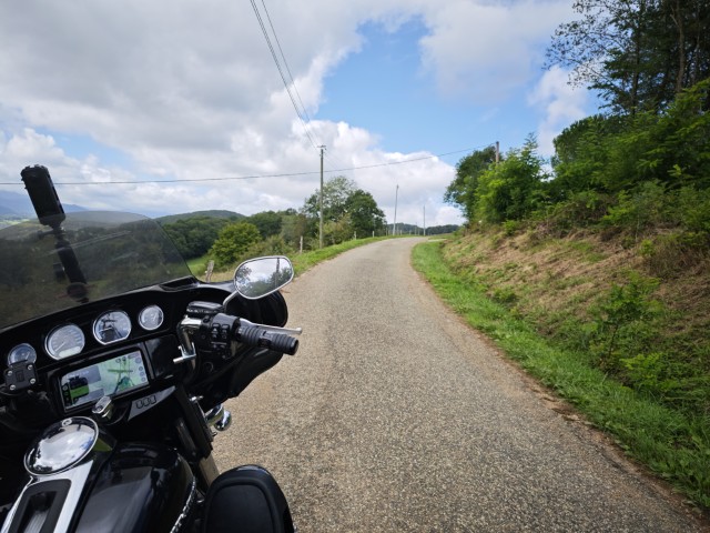 De zon schijnt als ik opsta, een goed begin dus. Na het ontbijt (met een zeer smakelijke croissant) rol ik de motor van de binnenplaats naar de straat voordat ik de Harley start, wel zo lief toch.