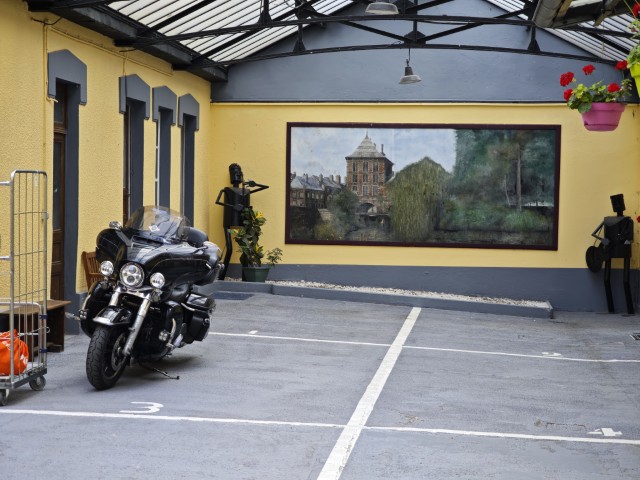 Onderweg nagenoeg geen spetters, en wat er spettert krijgt geen naam van mij. Bij Charleville-Mézières vind ik een slaapplaats in Hotel Paris. Een leuk Boutique hotelletje met een binnenplaats waar ik de motor kan plaatsen. Als eerste krijg ik een koud biertje in m'n handen geduwd van de man bij de receptie. Kijk dat is nou een warm, euh goed, welkom. Buiten zitten nog 2 Duitse motorrijders en nadat ik het papierwerk voor de kamer in orde heb gebracht ga ik buiten nog even kletsen met de mannen. Zij blijven enkele dagen in dit hotel en gaan de omgeving verkennen. Een van de mannen rijdt op een originele paarse BMW GS 100R Dakar uitvoeren, prachtig. Buiten het spuuglelijke kleurtje, tja over smaak valt te twisten he, een gave originele motor.