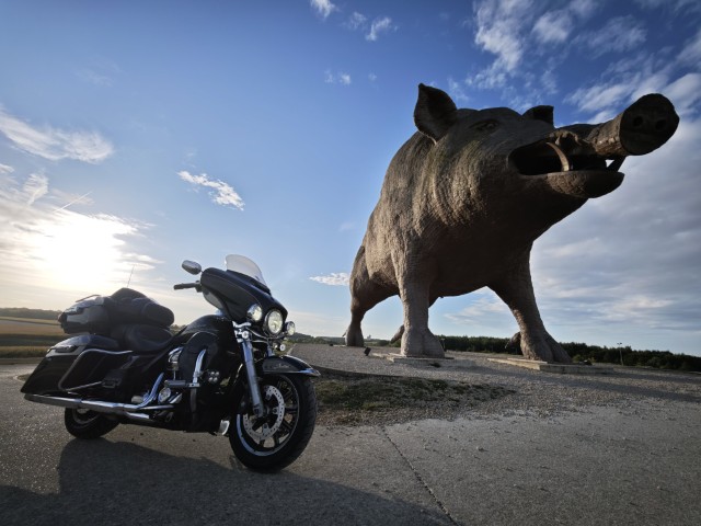 Ik stuur het stadje uit. Eerst een stuk binnendoor, kronkelend over de doorgaande wegen en dan toch naar de snelweg. Daar zie ik het gigantische wild zwijn, Woinic, opdoemen, dus even de afslag nemen naar de andere kant voor foto en film.