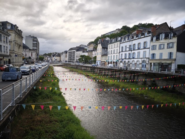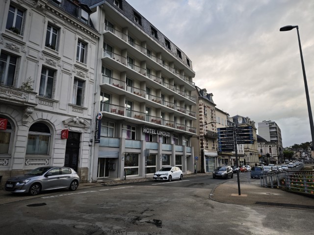 En na een paar keer wat drizzle regen te hebben gehad breekt dan toch de wolken open en krijg ik een plens met water over me heen. Geen tijd om een regenjas aan te trekken, dus even doorbijten door de bui. Bij een stopplaats regenjas aan en kijken voor een hotel. In Tulle vind ik in het centrum een hotel met plek. Om de hoek een hapje gegeten. Nu tijd om mn bed in te duiken.